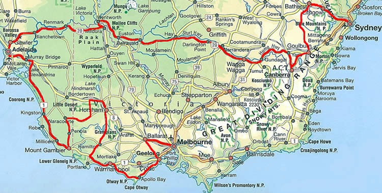 – Tourenvorschläge für die Fahrt von Melbourne nach Adelaide.